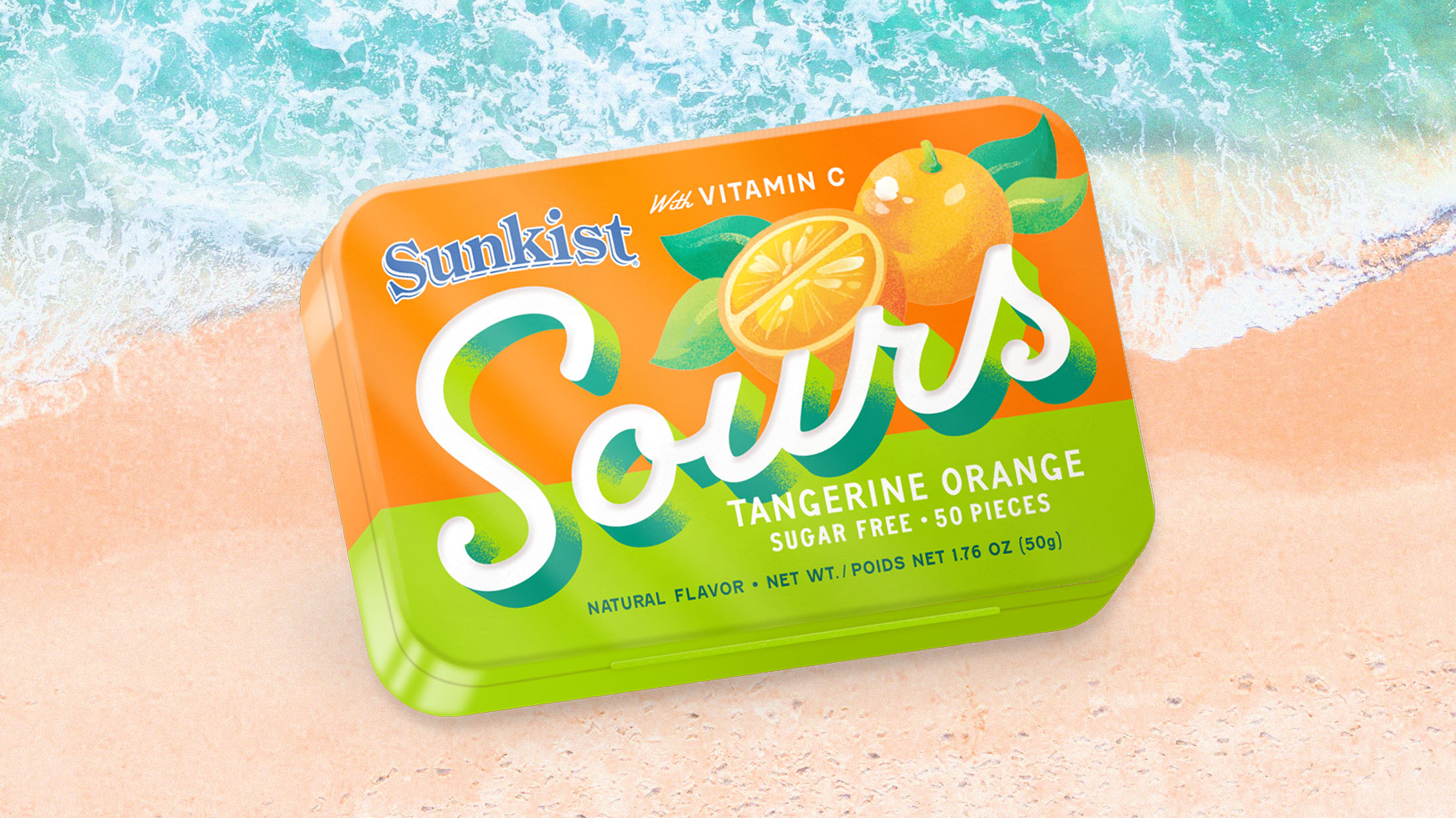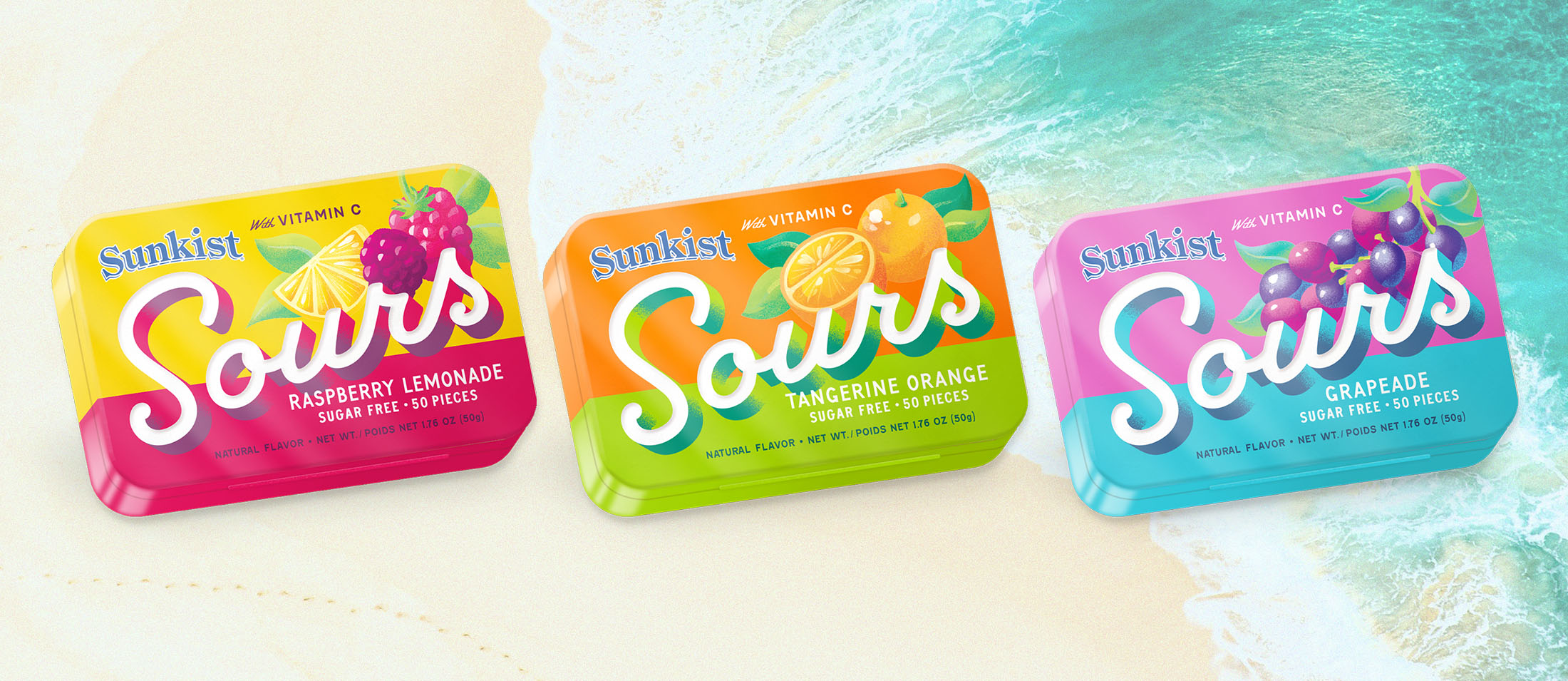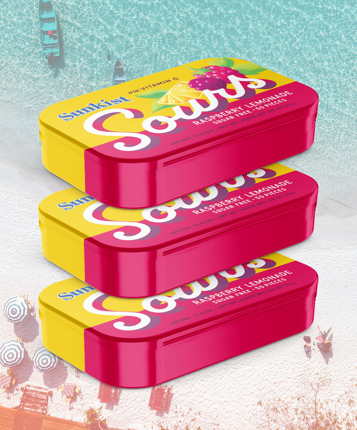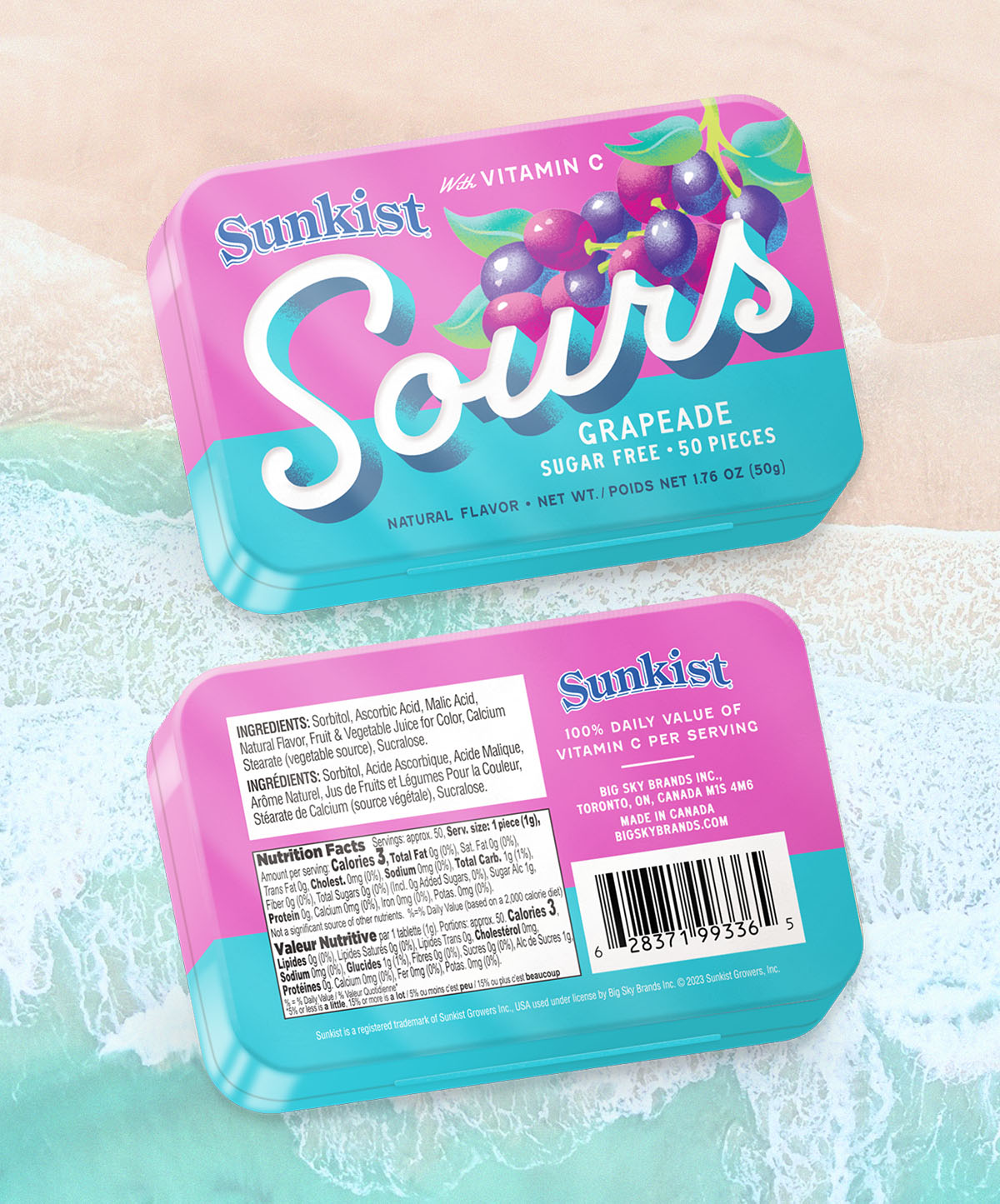 Sunkist Sours, licensed by Big Sky Brands, offers fruit-flavoured sugar free mint candies with a bold, energetic flavours. The reinvented packaging shifts the product into an eye-catching lifestyle product, positioning Sunkist Sours as a vibrant and colourful, evoking sunny days and sun-drenched beaches